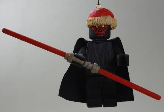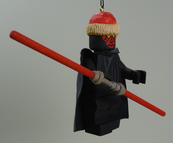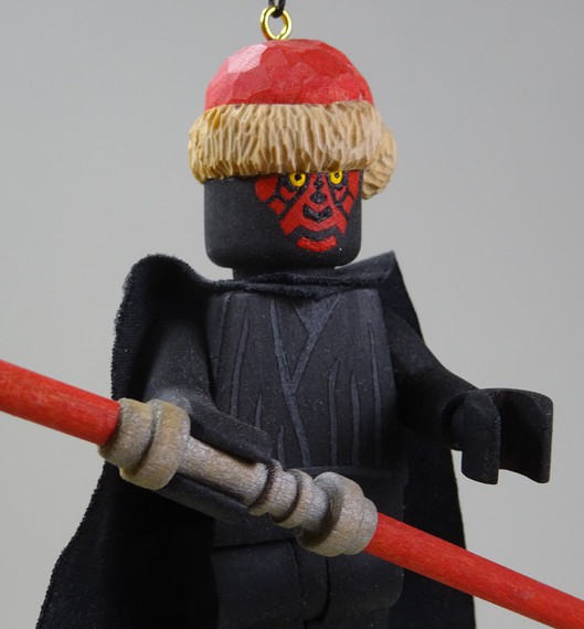 Carved this all wood Darth Maul Lego ornament for my son. The most complicated ornament that I've crafted. Used a woodlathe, scroll saw and plenty of carving tools to craft this piece.