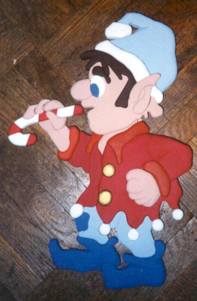 A scroll saw was used to cut out all the pine wood parts of the elf. I then carved and painted each piece to give it a 3D effect . Last but not least all pieces were
