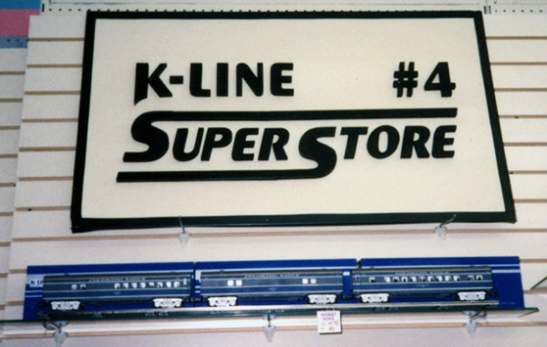 This sign was made for a local hobby shop in Brooklyn, NY. K-LINE is a company that specializes in electric hobby trains. Crafted sign in early 1990s