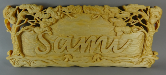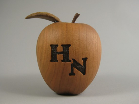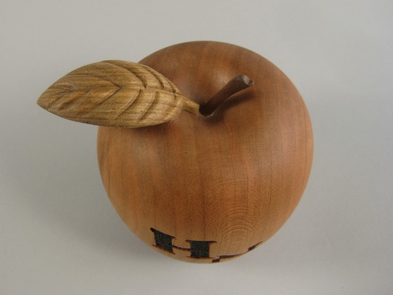 The apple was carved from a block of Cherry wood and the stem from walnut. For the leaf, I used butternut wood. Relief carved the monogram and woodburned. Applied several coats of wipe-on polyurethane.