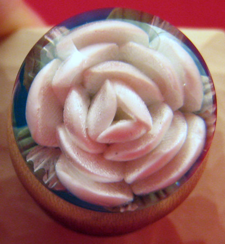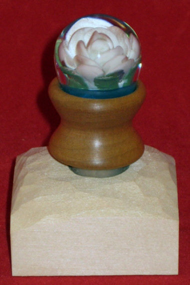 I purchased a block of plastic with a white rose inside the block. I then turned the block into a dome shape. The base was woodturned from a block of maple.